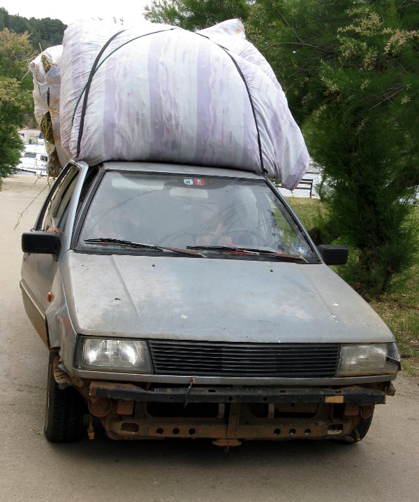 Pro Ladung und Fahrt konnten wir etwa fünf gefüllte Duvet-Anzüge auf die Barbinja fahren. Die Felder und auch die Barbinja liegen aber leider nicht gleich neben den Strässchen, auf welchen unser altes Vehikel fahren kann, sondern das Heu musste jeweils immer zum Auto getragen werden und vom Feldweg zum Heu-Stall auf der Barbinja. Zuerst das Mähen mit der Sense, dann das Schleppen der vollgestopften Duvet-Anzüge, das war ein richtiger Krampf!