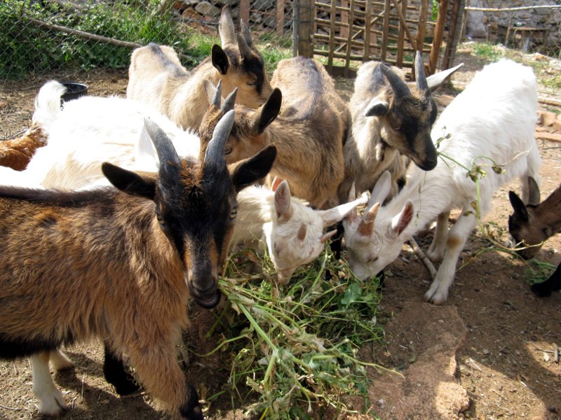 Normalerweise erhalten die Ziegen entweder geschnittene Büsche und Sträucher als Futter oder frisch gemähtes Gras. Meistens werden sie zusätzlich noch mindestens einmal pro Tag nach draussen geführt und dort in der Makija irgendwo angebunden, wo sie selbst fressen können, was ihnen passt. Wenn aber die Zeit nicht reicht, Futter zu sammeln oder die Ziegen herauszulassen, darf man ihnen auch Heu geben. Doch Heu ist ein rares Gut und darf darum den Ziegen wirklich nur in Notfällen gegeben werden.
